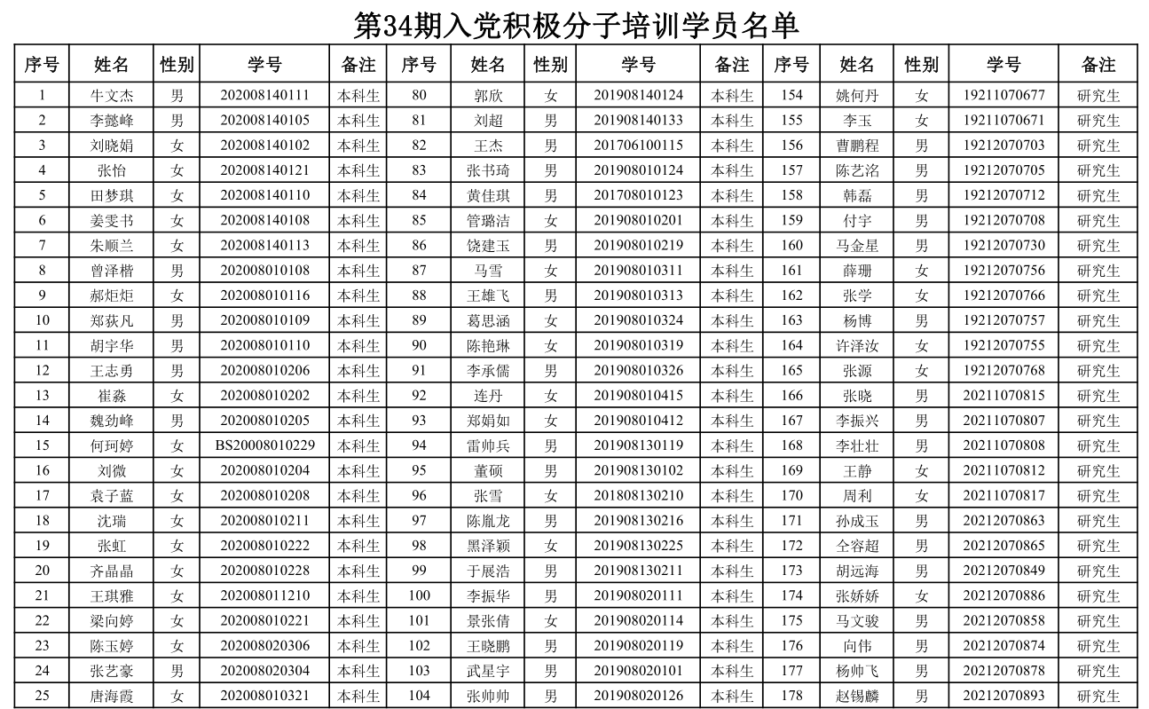 第34期入党积极分子名单公示