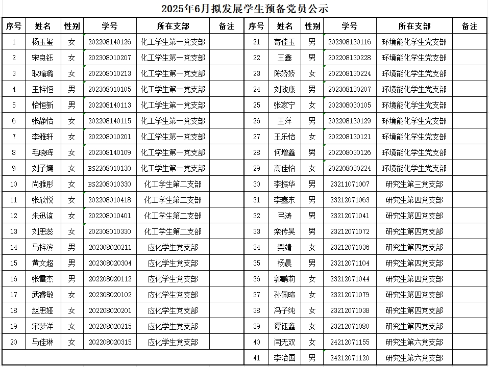 在各支部2025年6月支部大会讨论拟发展预备党员的基础上,2025年7月16日,经英国365党委会审议讨论,同意接收杨玉玺等41名同志为中共预备党员,根据发展党员工作有关要求,现予以公示。