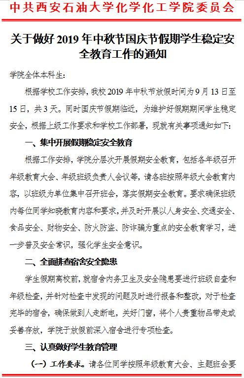 【安全教育】关于做好2019年中秋节国庆节假期学生稳定安全教育工作的通知